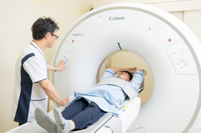X線を使って体の断層画像を撮影することで、数ミリの病変検出が可能です。AI技術を活用した最新CT装置の導入により、ディープラーニング再構成の大幅なノイズ低減効果で高精細な画像が得られ、被ばく低減も可能です。