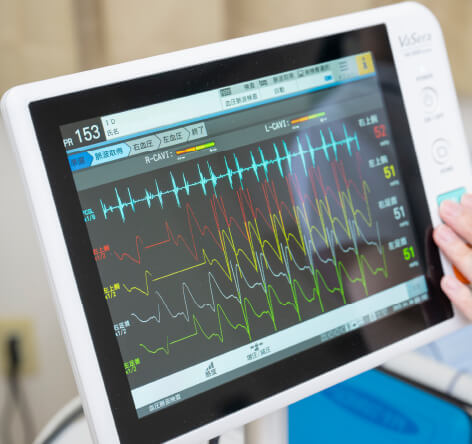 血管の硬さやつまり具合を調べる検査です。手と足の血圧を比較したり、脈波の伝わり方を測定したりすることで、動脈硬化の程度を数字で評価します。FUKUDADENSI社の血圧脈波検査装置「VaSera VS-2500システム」を導入し、CAVI値(血管の硬さ、血管年齢)とABI値(血管の詰まり具合)を測定。検査時間は数分で、ベッドに仰向けの状態で行います。血圧計と心音図を装着するだけの安全な検査です。